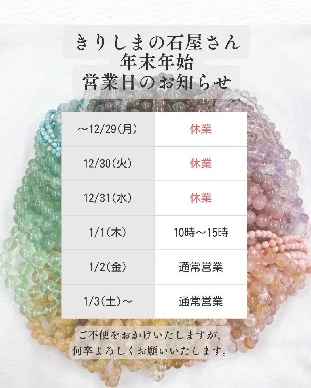 202512.28 お知らせ *きりしまの石屋さん 年末年始の知らせ* きりしまの石屋さん 年末年始の営業日および休業日の お知らせです。 ・ 12月29日(月)〜31日(水)休業 1月1日(金)10時open〜15時close 1月2日(土)〜通常営業 ・ 早いもので、今年も残すところあとわずかとなりました。 本年も多くのお客様に支えられ、 充実した一年を過ごすことができました。 スタッフ一同、心より感謝申し上げます。 新しい年が皆様にとって 素晴らしいものとなりますよう、 心よりお祈り申し上げます。 ・ 休業期間中にいただいた お問い合わせにつきましては、 1月1日(金)より順次回答させていただきます。皆様にはご不便をおかけいたしますが、何卒ご了承のほどお願い申し上げます。 ・ きりしまの石屋さんInstagramアカウントはこちらから☟ https://www.instagram.com/yumemi_stone/ ・ きりしまの石屋さんHPはこちらから☟ HP→https://craftgarden.jp/ ・ ✼••┈┈┈┈••✼••┈┈┈┈••✼ インスタLIVE配信中 ✼••┈┈┈┈••✼••┈┈┈┈••✼ ・ 入荷商品や、お得な天然石達を配信中! 天然石についてのご質問等も、 お気軽にコメントしてください。·͜·。 ✨木曜日 21時~(2時間) ✨土曜日 9時30分~(1時間) ※時間変更などは、 ストーリーにてご確認ください。 ・ 店舗 🏠霧島市霧島田口2638-539 お問い合わせ電話番号 ☎️090-1601-6132 営業時間 ⏳10時〜17時 定休日 🗓️水曜日 ・ #きりしまの石屋さん#石屋さん#k_ishiyasan#パワーストーン#天然石powerstone原石アクセサリー鹿児島霧島霧島神宮宮崎都城オリジナルブレス作kagoshimamiyazaki 記事一覧 新着情報 2025.12.28 お知らせ *きりしまの石屋さん 年末年始の… 2025.12.19 イベント *2026年 10万円 開運袋 … 2025.12.19 イベント *2026年 5万円 開運袋 ご… 2025.12.19 イベント *2026年 1万円開運袋 ご予… 2025.12.15 イベント *年末感謝saleのお知らせ* 2025.12.12 お知らせ *2026年 開運袋のご予約方法… カテゴリー イベント (48)お知らせ (114)サンキャッチャー (4)ストラップ (1)ネックレス (6)パワーストーンについて (2)ピアス (3)ブレスレット (22)ブログ (32)原石 (41)店長のつぶやき (21)浄化 (37)誕生石 (21) 月別アーカイブ 2025年 12月 11月 10月 9月 8月 7月 6月 2月 1月 2024年 12月 11月 10月 9月 8月 7月 6月 5月 1月 2023年 12月 8月 7月 6月 2月 1月 2022年 12月 11月 10月 9月 8月 7月 6月 5月 4月 3月 2月 1月 2021年 12月 11月 9月 8月 6月 5月 4月 3月 2月 1月 2020年 12月